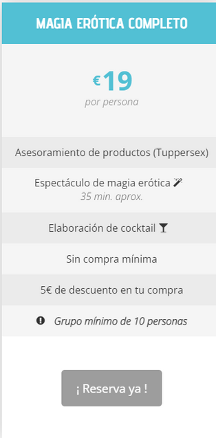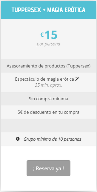 Somos los más originales, y por eso repetirás con nosotros. Ya que en cada TupperSex traemos muestrario y estoc diferente. Además de ofreceros servicios diferentes para todos los que ya habéis hecho TupperSex anteriormente, sea con nosotros o no. Para ello estamos orgullosos de presentarte nuestro espectáculo de magia erótica exclusivo. Se trata de un show mágico en que cambiamos todos los instrumentos de la magia por productos que después verás en el TupperSex. Es un show con un tono picante y divertido pero en ningún caso sexual. Descúbrelo aquí.